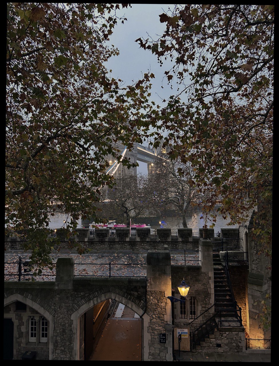 17 November 2025photoLondonskyTower of LondonlandscapeDusk, street light, Tower of London The Tower of London embattlements at dusk: rain, stone, and the Thames below.